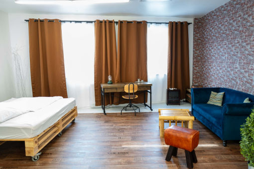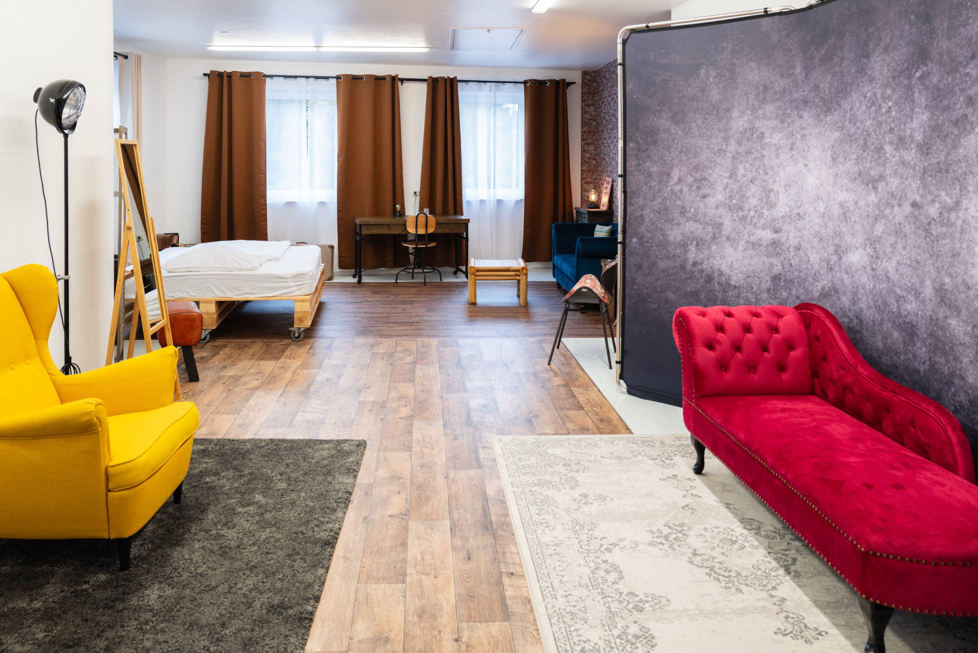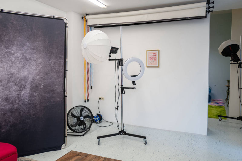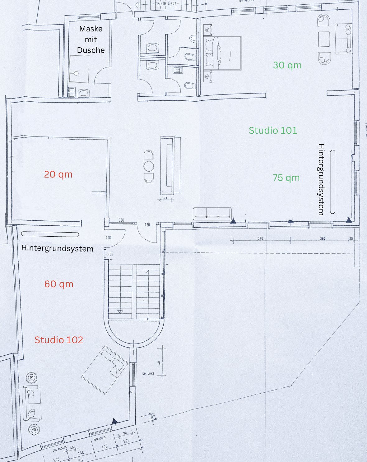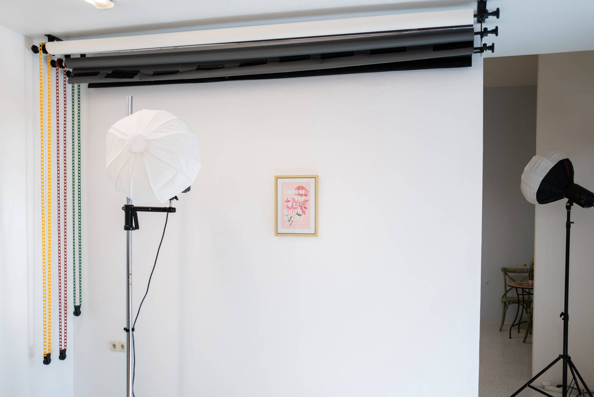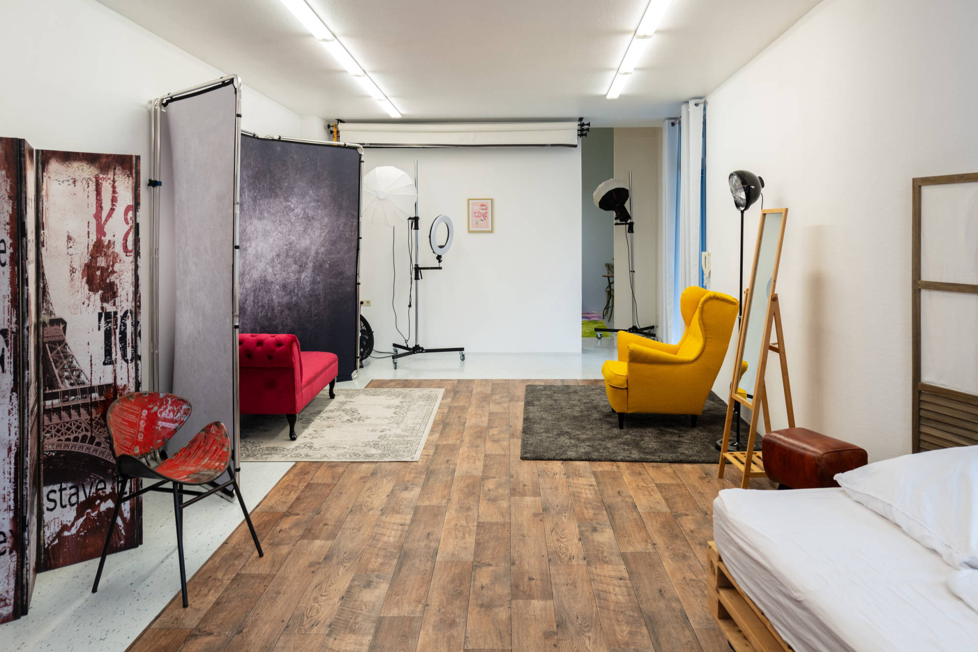 Das Studio besteht aus zwei Räumen. Davon ist ein Raum mit 4 verschiedenen Farben gestrichen. Alle Fenster sind durch Vorhänge und elektrische Rollläden zu verdunkeln. Ein Hintergrundsystem (2,72 m breit) mit 3 Rollen und ein Lastolite Panorama-Hintergrund (4 m breit) sind vorhanden.